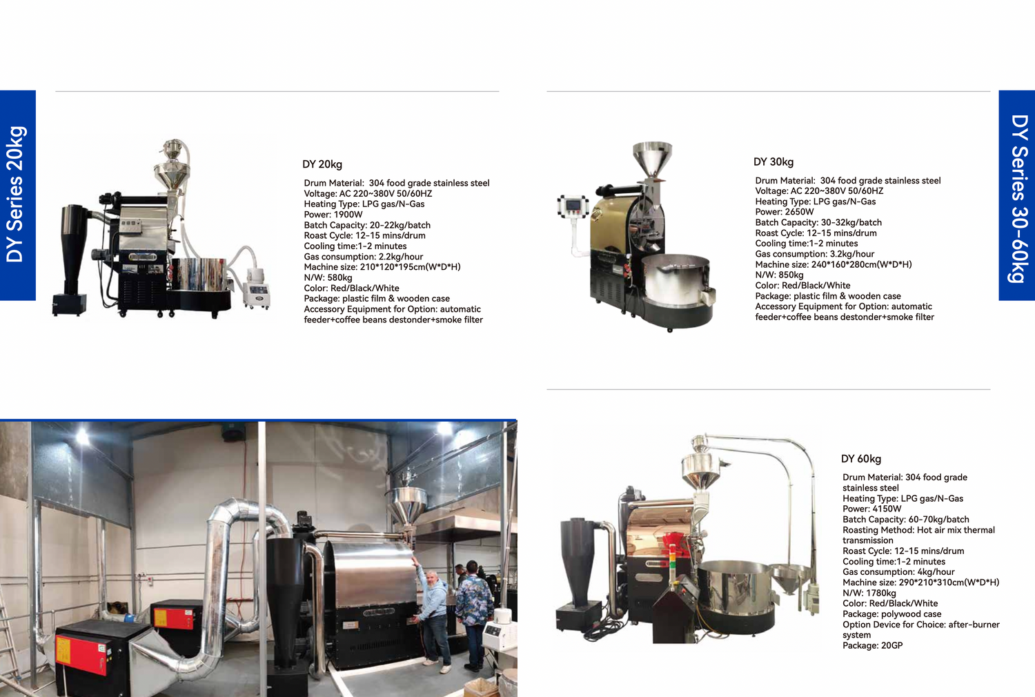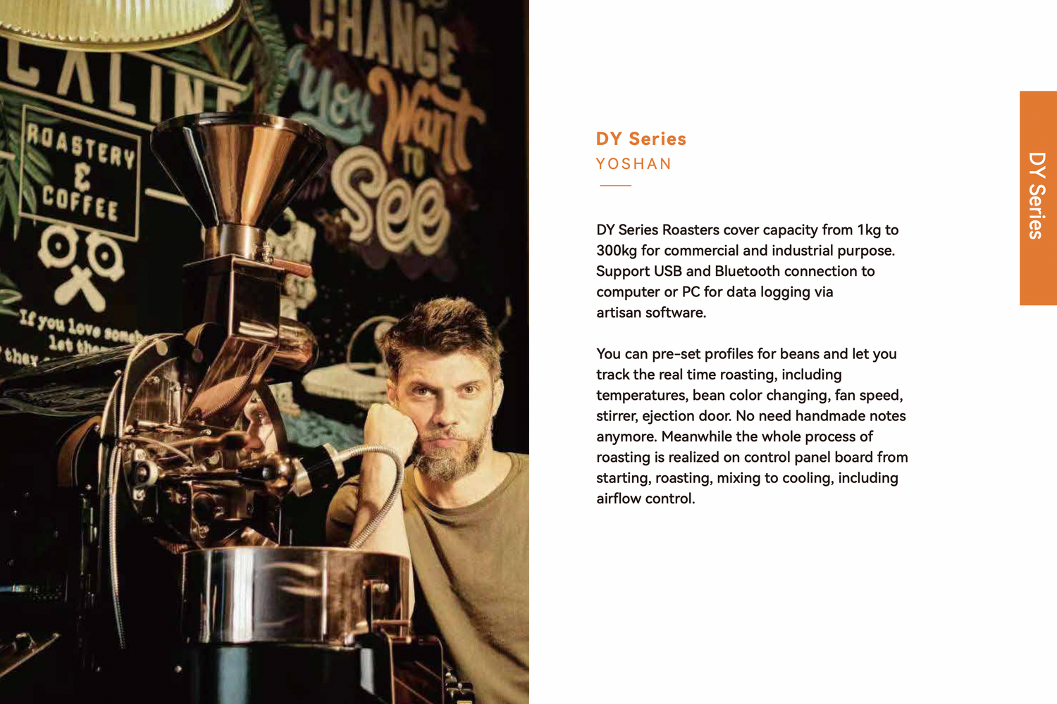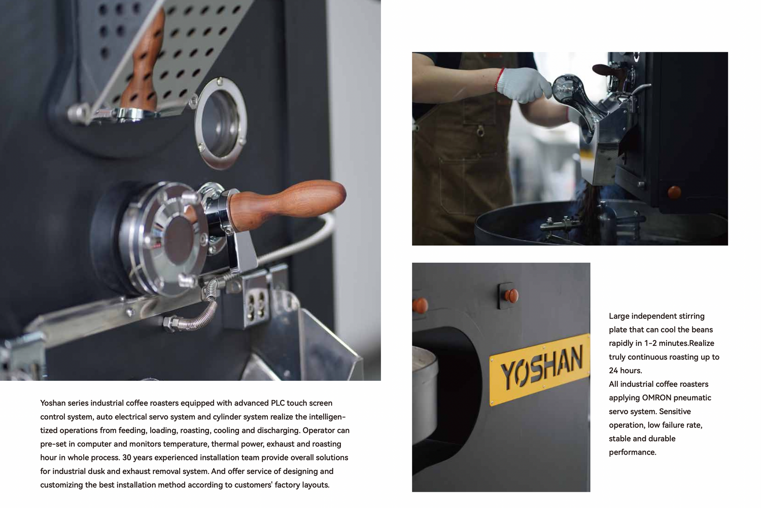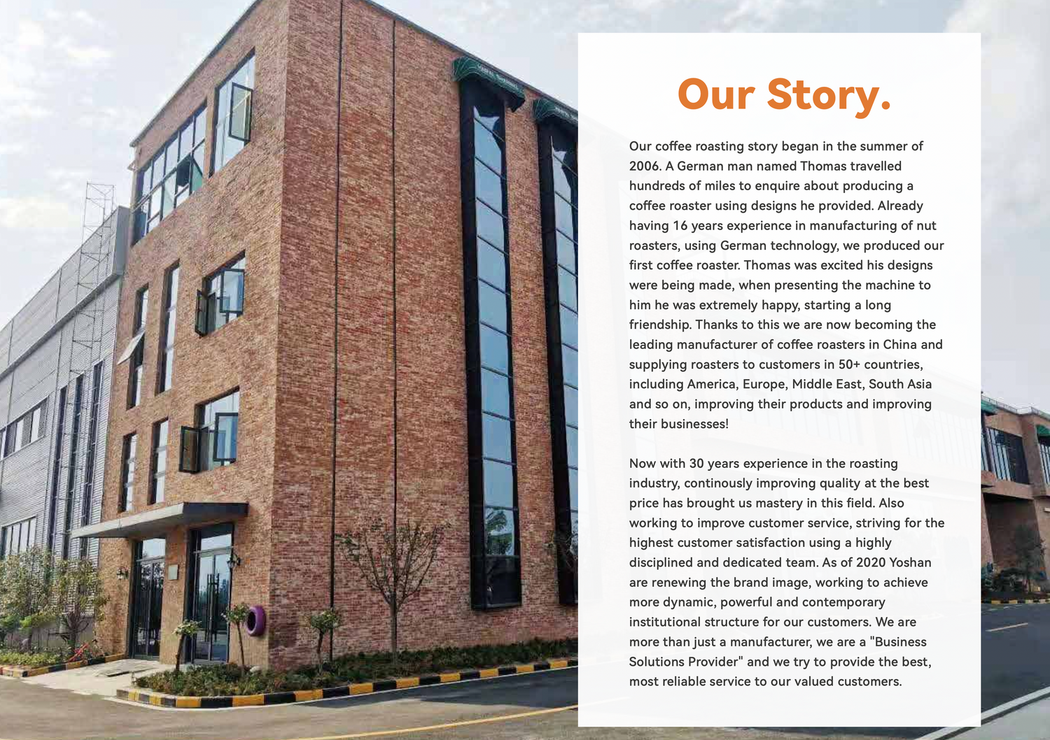 Durante 30 años Dongyi Yangshan Mechanical Equipment Co. Ltd., ha brindado la mejor solución para el tostado y procesamiento del café, utilizando tecnología alemana y motores japoneses; posicionándose como el fabricante lider en tostadores de café en China. La capacidad de sus tostadores va desde 1 kg hasta 300 kg. Actualmente, Yoshan es la única empresa capaz de producir tostadores de café de hasta 100 kg+ en China.