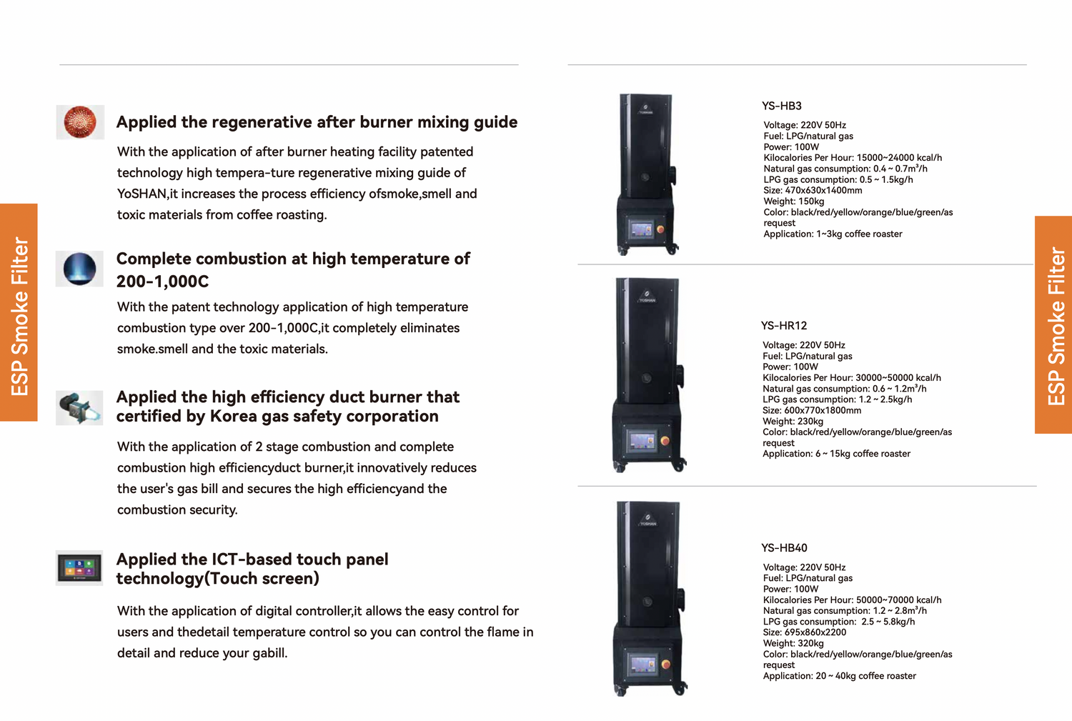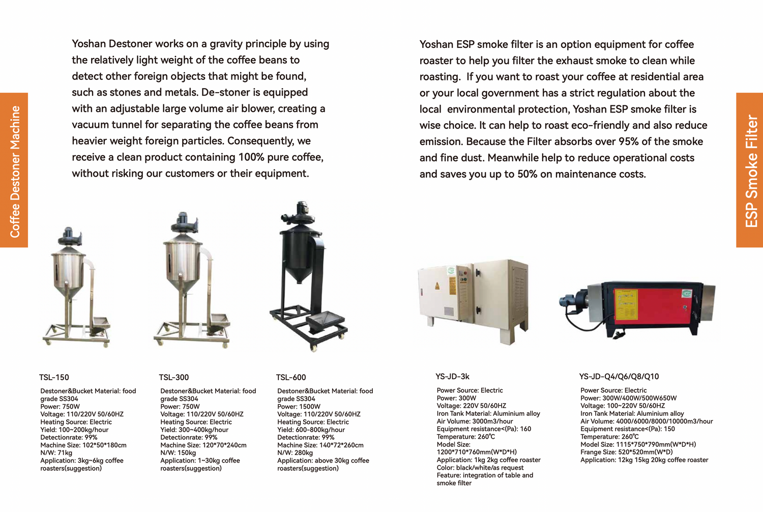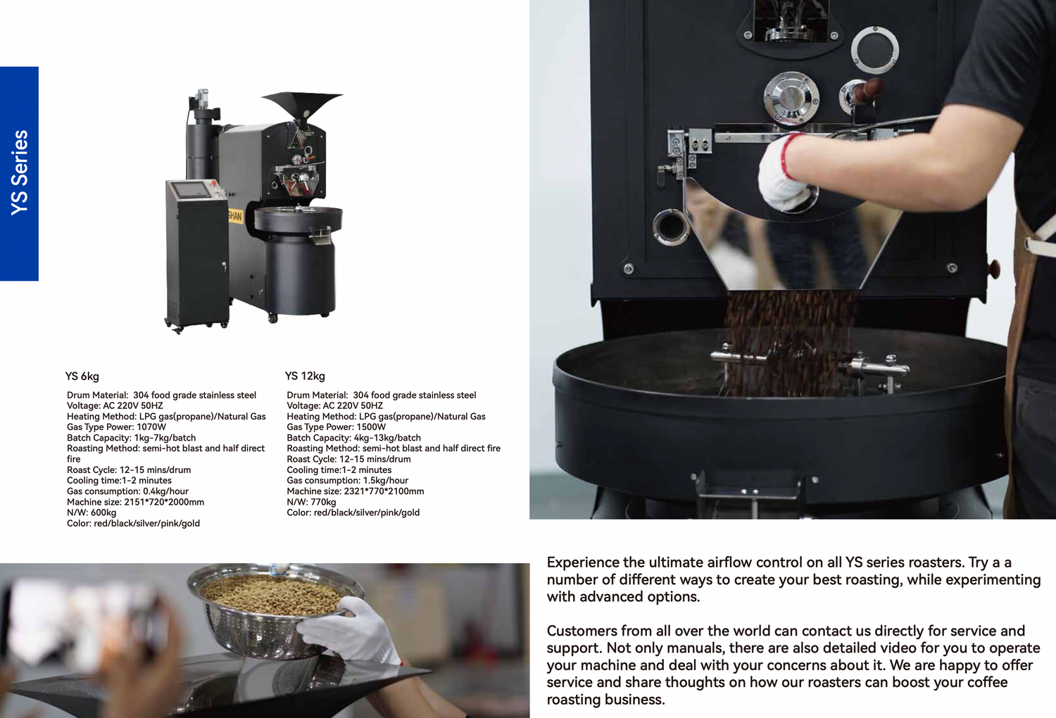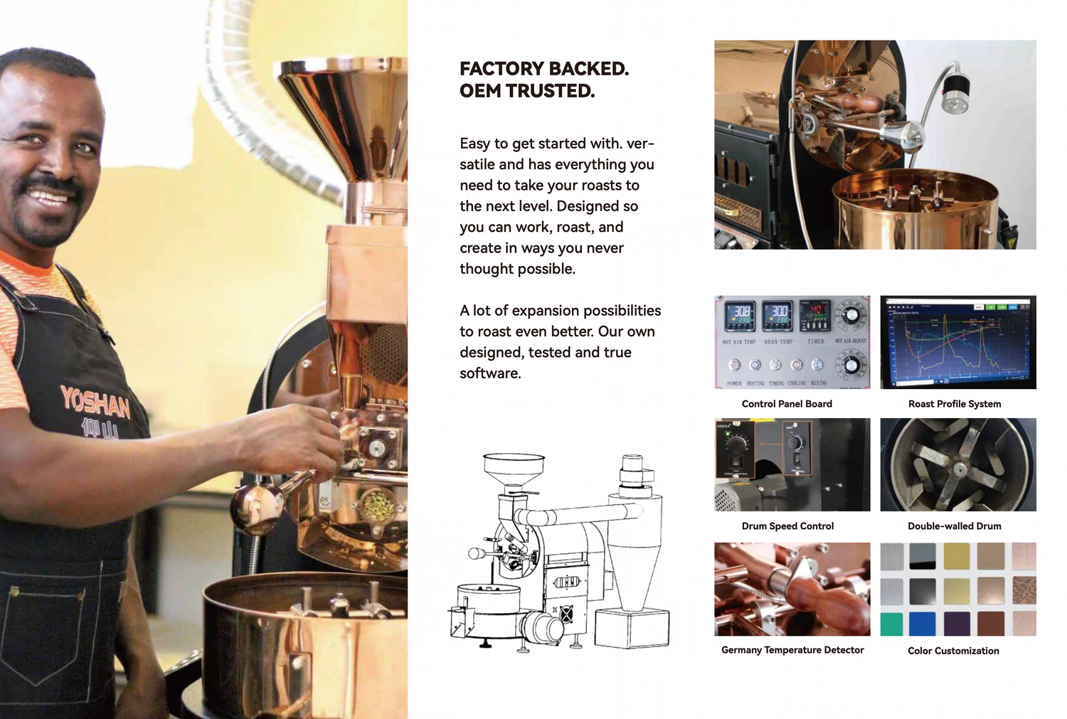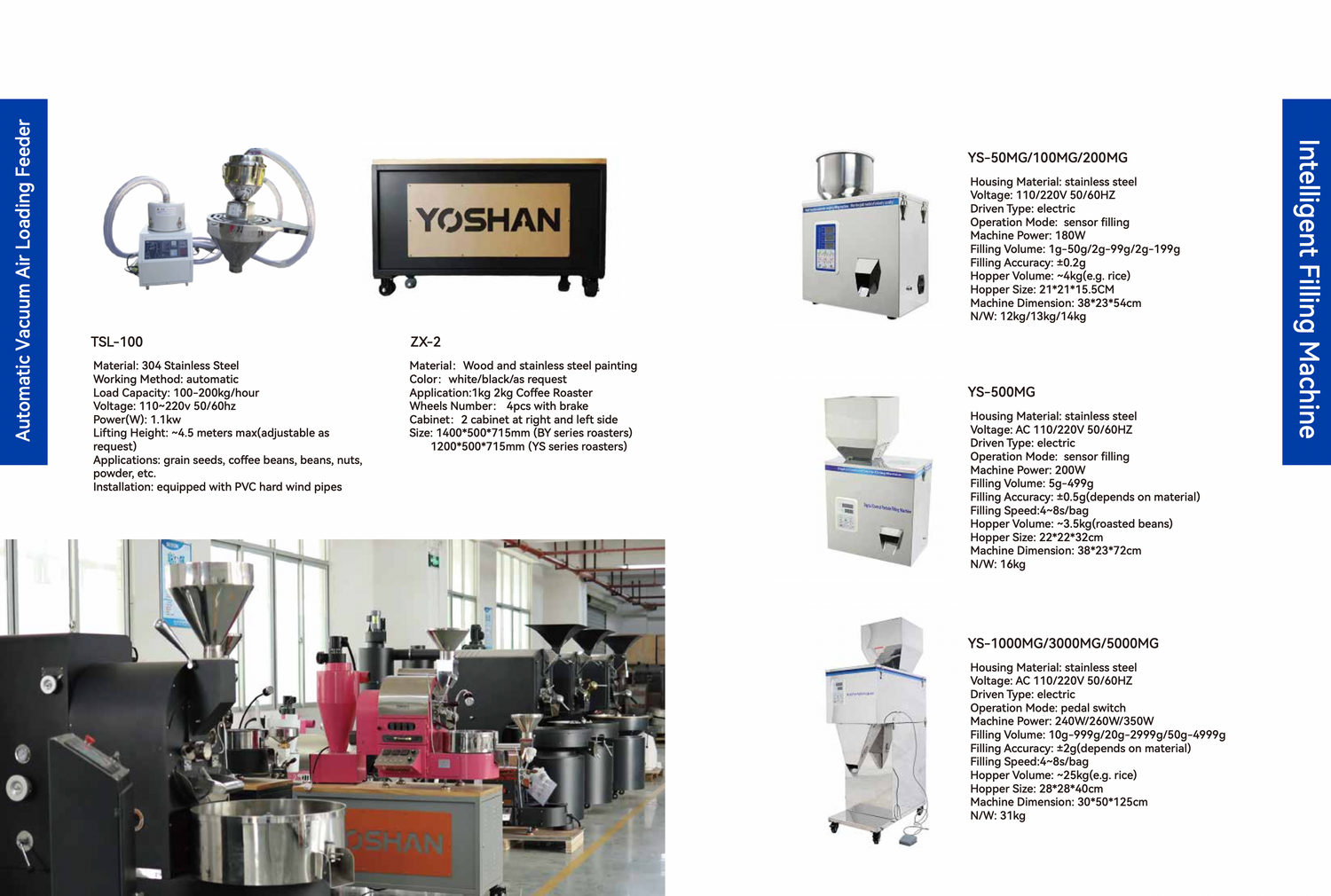 Durante 30 años Dongyi Yangshan Mechanical Equipment Co. Ltd., ha brindado la mejor solución para el tostado y procesamiento del café, utilizando tecnología alemana y motores japoneses; posicionándose como el fabricante lider en tostadores de café en China. La capacidad de sus tostadores va desde 1 kg hasta 300 kg. Actualmente, Yoshan es la única empresa capaz de producir tostadores de café de hasta 100 kg+ en China.